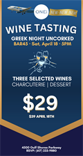 Join us at OneClub in Gulf Shores, Alabama on Thursday, April 18 at 5 PM for Greek Night Wine Tasting! Enjoy three wine and charcuterie pairings plus a dessert pairing. Early bird tickets are $29, and day-of tickets are $39. Sip, savor, and celebrate Greek flavors in a fun evening with friends!
